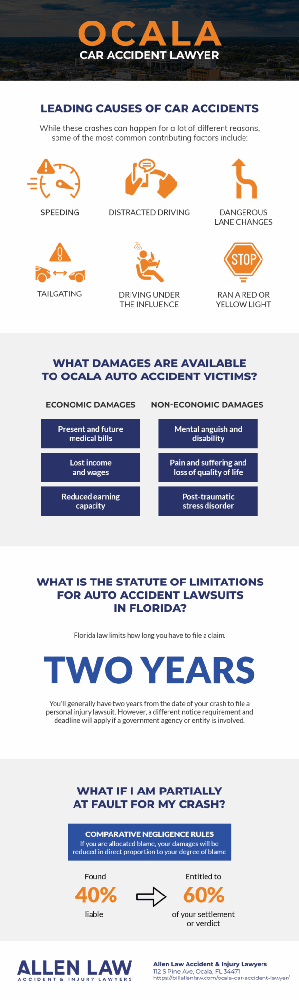 Were you recently involved in a car accident in Ocala, FL? Are you struggling with severe injuries and finding that it’s hard to get back on your feet? You don’t have to navigate these difficult times on your own. Call Allen Law and let our skilled car accident attorneys in Ocala help.